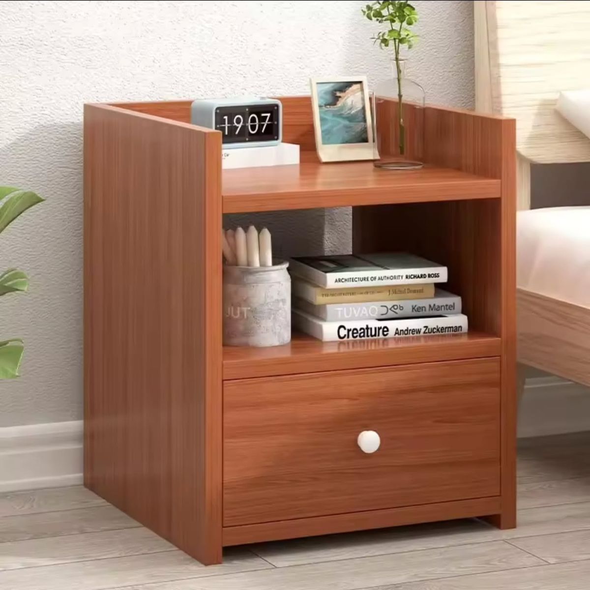 - Warm wood-grain finish that complements any bedroom interior